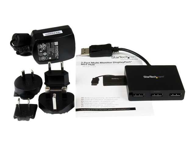 - Information This MST hub lets you connect three monitors to your DisplayPort (DP) 1.2 equipped Windows laptop or desktop. The newest generations of computers are more portable than ever, which often means that you're left with fewer video outputs and smaller integrated screens. This MST hub solves both of these problems by letting you connect three additional displays to your computer, which makes multitasking much easier. With the MST hub, you can use DisplayPort video adapters and cable adapters that enable you to connect HDMI, VGA or DVI displays. This ensures your MST hub will be compatible with virtually any television, monitor or projector. This MST hub is VESA and DisplayPort certified to support DP 1.2 enabled systems, for seamless integration with your existing video equipment. Using the MST hub, you can extend your desktop onto additional monitors and stream independent content to each display giving you the freedom to multitask and increase your productivity. You can also mirror the same image onto multiple displays for remote viewing applications such as digital signage. MST technology uses your existing video card to minimize the use of system resources while delivering Ultra HD 4K resolutions. This unprecedented performance makes MST perfect for high-resolution applications such as graphic design, gaming and medical imaging. Note: When using a DisplayPort 1.1 video card the MSTDP123DP will act as splitter, automatically mirroring your video source across all displays. Resolution limitations apply. Note: MST shares 21.6 Gbps across all attached displays. Higher resolutions can restrict the available bandwidth with the remaining ports. Certain graphics adapters have limited MST support and will only output to three displays in total. If more than three monitors are attached the fourth will be disabled.